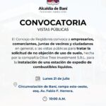 Concejo de Regidores de Baní convoca a vistas públicas para conocer solicitud de no objeción de uso de suelo para instalación de estación de combustibles